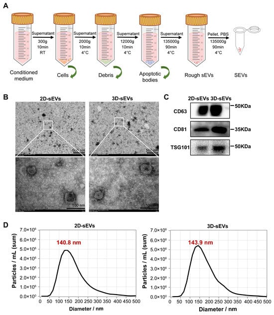 The 2D-MSC conditioned medium was collected on Day 3 and 3D-MSC conditioned medium was collected on Day 5. Here, we utilized dUC, the most frequently used method, for 2D-sEV and 3D-sEV isolation (Figure 3A), then we used TEM, WB and NTA for sEV characterization []. Both 2D-sEVs and 3D-sEVs showed a morphology with a spherical or oval-shaped appearance, which was consistent with previous reports describing the typical morphologies of sEVs (Figure 3B) []. WB analysis revealed that 2D-sEVs and 3D-sEVs expressed CD63, CD81 and TSG101, the markers of sEVs (Figure 3C). The NTA results showed that the peak diameter of 2D-sEVs was 140.8 nm and that of 3D-sEVs was 143.9 nm. The particle concentration in 3D-sEVs was significantly higher than that in 2D-sEVs, suggesting that 3D culture could obtain more particles of sEVs (Figure 3D). These results confirmed that particles harvested from the 3D cell culture system could maintain the character of sEVs like the traditional 2D cell culture system.