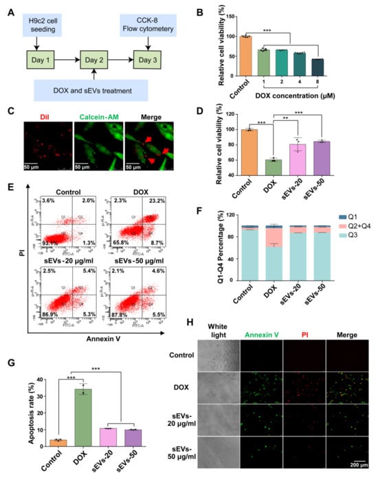 DOX is a widely used chemotherapy drug in the treatment of breast cancer, lymphoma and others []. However, it exhibited cardiovascular cytotoxicity and induced cardiomyocyte apoptosis or ferroptosis []. In this study, the therapeutic function of sEVs was verified by assessing H9c2 viability under DOX-induced injury (Figure 4A). The cell viability of H9c2 cells with gradient concentrations of DOX ranging from 1 to 8 μM in H9c2 cells was evaluated using the CCK-8 assay. The results showed that DOX significantly reduced H9c2 cell viability at concentrations between 1 and 8 μM. Because 1 μM DOX reduced H9c2 cell viability to 62%, it was selected for further experiments (Figure 4B). To assess the cellular uptake of sEVs by H9c2 cells, Dil dye was used to label sEVs. After 6 h, Dil-labelled sEVs (red spots) could be observed in the cytoplasm of living H9c2 cells, indicating the quick cellular uptake of sEVs (Figure 4C). The sEVs at 20 μg/mL (equal to 2.5 × 1010/mL particles) and 50 μg/mL (equal to 6.25 × 1010/mL particles) exhibited significant treatment efficacy to DOX-induced cardio injury. The cell viability of H9c2 cells increased to ~80% with sEV treatment (Figure 4D). The cell apoptosis detected by flow cytometry showed that after sEV treatment, the percentage of Q1 (necrosis) and Q2 + Q4 (late and early apoptosis) decreased, while Q3 (living cell population) increased remarkably, compared to DOX model group (Figure 4E,F). Meanwhile, the apoptosis rate of H9c2 after sEV treatment at 20 μg/mL and 50 μg/mL decreased to ~10% (Figure 4G). Subsequently, decreased apoptosis was visualized using Annexin V/PI staining in the sEV-treated group compared to the DOX model group (Figure 4H). Taken together, 3D-sEVs ameliorated DOX-induced apoptosis in cardiomyocytes and exhibited higher protective efficiency.