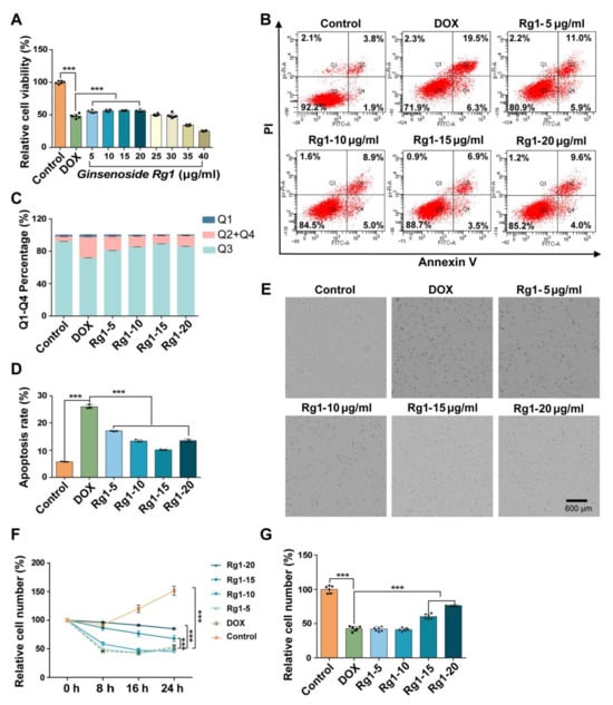 Ginsenoside Rg1 reduced DOX-induced H9c2 cell damage. (A) Relative cell viability of H9c2 cells with DOX and/or Rg1 for 24 h. n = 6. (B) Flow cytometry detection of Annexin V and PI stained H9c2 cells after treatments of DOX and/or Rg1. n = 3. (C) Percentage of Q1, Q2 + Q4, Q3 in Annexin V and PI stained H9c2 cells. n = 3. (D) Percentage of apoptotic cells (Q2 + Q4) in each group. n = 3. (E) Images of H9c2 cells at 24 h using ImageXpress Pico automated cell imaging system. Scale bar = 600 µm. n = 6. (F) Proliferation curve of H9c2 cells treated with DOX and/or Rg1 for 24 h. (G) The relative cell number of H9c2 cells at 24 h. n = 6. *** p < 0.001.