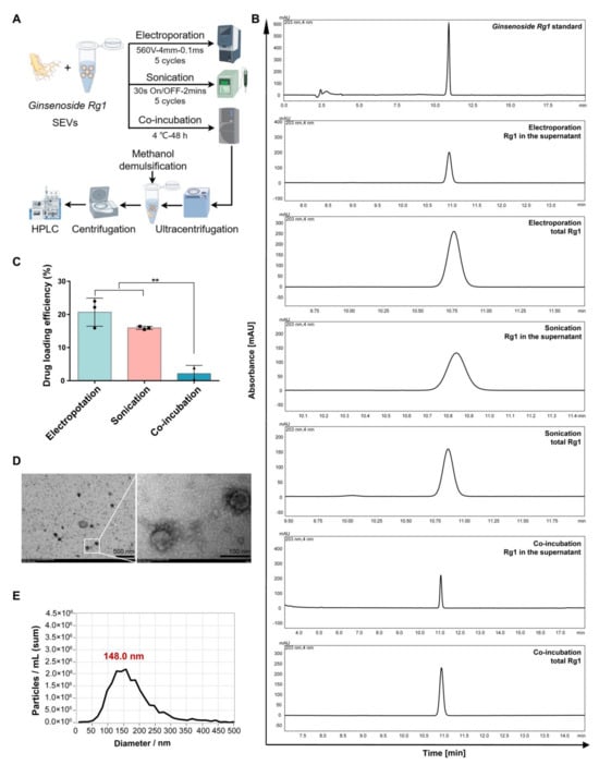 Ginsenoside Rg1 loading of 3D-sEVs. (A) Schematic diagram of Ginsenoside Rg1 loading with electroporation, sonication and co-incubation methods and following detection. (B) The HPLC chromatogram of Ginsenoside Rg1. (C) Drug loading efficiency of three methods. n = 3. (D) TEM images of Rg1-loaded sEVs. Scale bars = 500 nm and 100 nm. (E) The NTA diameter distribution of Rg1-loaded sEVs. ** p < 0.01.