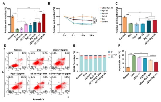 Rg1-loaded sEVs reduced DOX-induced H9c2 cell damage. (A) Relative cell viability of H9c2 cells treated with control, DOX, sEVs, Rg1, and sEVs + Rg1 for 24 h. n = 3. (B) Proliferation curve of H9c2 cells treated with DOX and/or Rg1 for 24 h. Cell number was pictured at each 8 h and counted using ImageXpress Pico automated cell imaging system. n = 3. The relative cell counts were normalized using the cell number at 0 h of each group. (C) The relative cell number of H9c2 cells at 24 h. (D) Flow cytometry detection of Annexin V and PI stained H9c2 cells after treatments of DOX and/or Rg1. n = 3. (E) Percentage of Q1, Q2 + Q4, Q3 in Annexin V and PI stained H9c2 cells. n = 3. (F) Percentage of apoptotic cells (Q2 + Q4) in each group. n = 3. *** p < 0.001, ** p < 0.01, * p < 0.05.