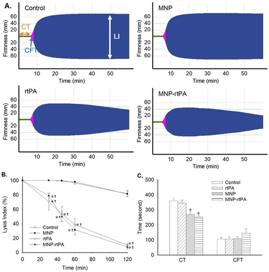The thrombolytic activity of the immobilized rtPA was preserved after covalent binding to the MNP. (A) Representative effects of the rtPA (2 μg/mL), MNP (21 μg/mL), and equivalent MNP-rtPA on thromboelastogram profiles; (B) thrombolysis was assessed by % lysis index with time; and (C) clotting time (CT) and clot formation time (CFT) were derived from thromboelastograms (n = 6). * p < 0.05 vs. the control values. † p < 0.05 vs. the corresponding MNP values.