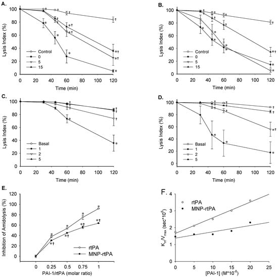 Covalent immobilization on MNP protects the rtPA from inactivation. Thrombolysis induced by free (A) and immobilized (B) rtPAs (2 μg/mL) after incubation with whole blood at the indicated time (0–15 min) is presented as % lysis index (n = 5–9). Blood withdrawal for analysis was conducted 1, 2, and 5 min after i.v. administration of free (C) and immobilized (D) rtPAs (0.2 mg/kg) (n = 4–6). Amidolysis induced by free and immobilized rtPAs as a function of molar ratios (E) and PAI-1 concentration (F) was determined (n = 3). * p < 0.05 vs. the control values. † p < 0.05 vs. the corresponding 0 min (A,B), 1 min (C,D), and rtPA (E) values.