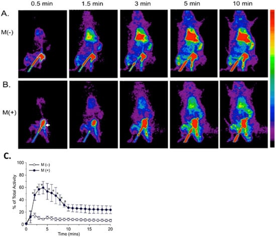 Representative μSPECT images of 99mTc-MNP-rtPA in a rat embolic model. The images demonstrated the biodistribution of 99mTc-MNP-rtPA in the absence (A) and presence (B) of magneto-guidance (white arrow) in a rat embolic model. The radio activities of the injection site denoted by the dotted lines in (A,B) were summarized with time in ((C); n = 3). Dynamic scintigraphic images were collected from 5 min before to 1 h after the administration of 99mTc-MNP-rtPA with 10-sec intervals per image. Each presented image is a fused image of 30 s. * p < 0.05 vs. the group without magneto-guidance.