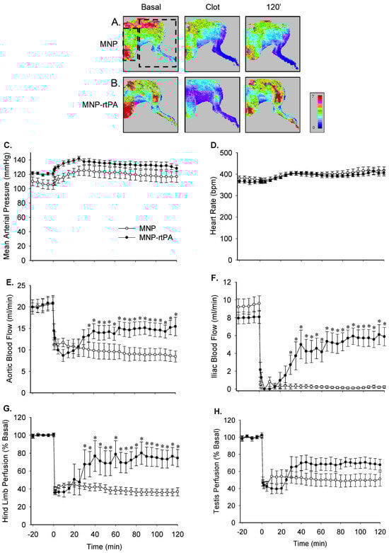 Thrombolytic effects of the MNP-rtPA in a rat embolic model. Representative tissue perfusion of the left hind limb and testis of rats in response to the MNP (A) or MNP-rtPA (B) targeting was acquired with a laser speckle imager in the designated area, as illustrated with the left and right squares in mean arterial pressure (C), heart rate (D), aortic blood flow (E), iliac blood flow (F), hind limb perfusion (G), and testis perfusion (H), which were measured after introducing a whole blood clot (1.5 × 2 mm) into the left iliac artery at time 0. MNP-rtPA (0.2 mg/kg) or equivalent MNP (2 mg/kg) were administered from the right iliac artery 5 min after introducing the clot with magnetic guiding (n = 8). * p < 0.05 vs. the MNP values.