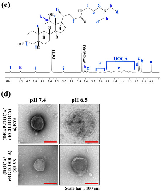 To synthesize pH-responsive EVs targeting αvβ3 integrin receptors on tumor cells (Figure 1a), we isolated EVs from RAW264.7 cells and integrated DOCA derivatives (DEAP-DOCA and cRGD-DOCA), along with 5-FU (a model drug for antitumor activity) [17,18,19,39], into the EVs, resulting in the fabrication of (5-FU/DEAP-DOCA/cRGD-DOCA)@EVs. DEAP-DOCA was synthesized by chemically conjugating DEAP to DOCA in DMSO containing EDC and NHS (Figure 1b). The resulting DEAP-DOCA was analyzed using 1H NMR, where we characterized the integration ratio of the peaks at δ 2.42 ppm (-CH2- from DEAP) and δ 4.20 ppm (-CH from DOCA) (Figure 1c). Consequently, the molar conjugation ratio of DEAP to DOCA was determined to be 1:1. Furthermore, cRGD-DOCA was prepared by chemically coupling DOCA (preactivated using AEM in DMSO containing EDC and NHS) with the cRGD peptide through the thiol–maleimide click reaction (Figure S1a). Through characterization of the integration ratio of the 1H NMR peaks at δ 6.51 ppm (-CH- from cRGD) and δ 4.20 ppm (-CH from DOCA), the molar conjugation ratio of cRGD to DOCA was assumed to be 1:1 (Figure S1b). Subsequently, 5-FU, DEAP-DOCA, and cRGD-DOCA were incorporated into the EVs using the sonication method. We prepared various formulations, including (5-FU/DEAP-DOCA/cRGD-DOCA)@EVs, (5-FU/DOCA/cRGD-DOCA)@EVs (without DEAP), (5-FU/DEAP-DOCA)@EVs (without cRGD-DOCA), (5-FU/DOCA)@EVs (without DEAP and cRGD), and (5-FU)@EVs (as a control group). The loading efficiency of the 5-FU, DEAP-DOCA (or DOCA), and cRGD-DOCA in the EV samples ranged from approximately 8.4% to 9.0% by weight, 42.4% to 43.0% by weight, and 28.0% to 34.0% by weight, respectively. The loading content of the 5-FU, DEAP-DOCA (or DOCA), and cRGD-DOCA in the EV samples ranged from approximately 16.5% to 18.4% by weight, 21.1% to 21.8% by weight, and 2.9% to 3.3% by weight, respectively.