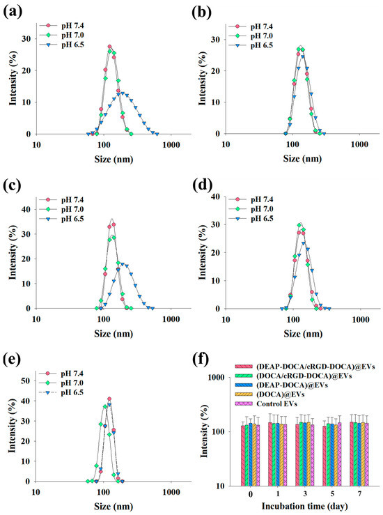 Particle size distribution of (a) (DEAP-DOCA/cRGD-DOCA)@EVs, (b) (DOCA/cRGD-DOCA)@EVs, (c) (DEAP-DOCA)@EVs, (d) (DOCA)@EVs, (e) control EVs at pH 7.4, 7.0 and 6.5 (n = 3, as multiple experiments). (f) Average particle size of each EV sample incubated in PBS (150 mM, pH 7.4) for 7 days at 37 °C (n = 3, as multiple experiments).