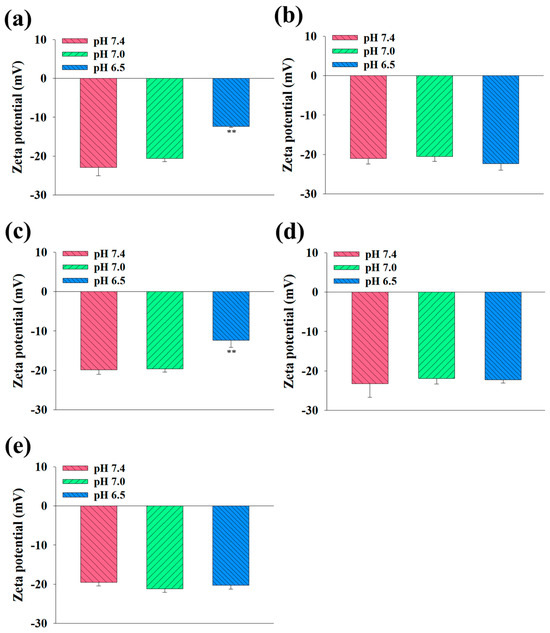 Zeta potential values of (a) (DEAP-DOCA/cRGD-DOCA)@EVs, (b) (DOCA/cRGD-DOCA)@EVs, (c) (DEAP-DOCA)@EVs, (d) (DOCA)@EVs, and (e) control EVs at pH 7.4, 7.0 and 6.5 (n = 3, as multiple experiments, ** p < 0.01 compared to pH 7.4).