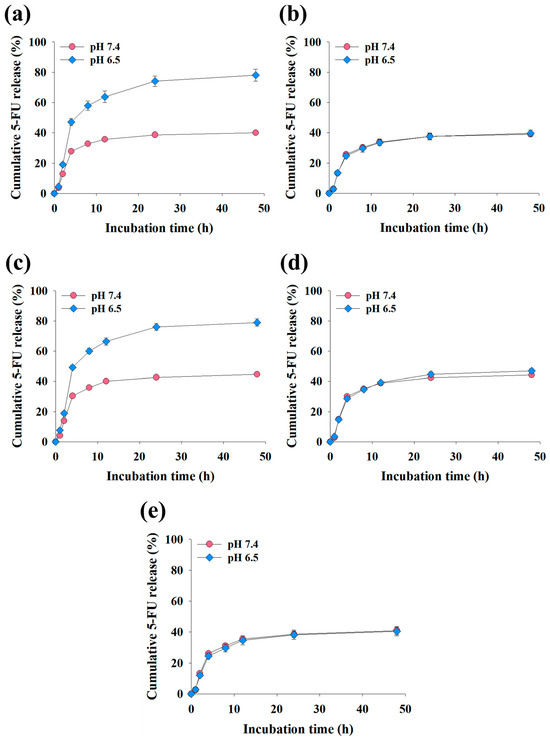 The cumulative 5-FU release profiles of the EV samples under various pH conditions are illustrated in Figure 4. Notably, the (5-FU/DEAP-DOCA/cRGD-DOCA)@EVs and (5-FU/DEAP-DOCA)@EVs exhibited a release of 40–45 wt % of 5-FU at pH 7.4, whereas at pH 6.5 [30,41], they displayed an almost twofold increase, releasing 78–79 wt % of 5-FU after 48 h of incubation. Furthermore, their 5-FU release rate was significantly augmented at pH 6.5 in comparison to the (5-FU/DOCA/cRGD-DOCA)@EVs (Figure 4a–c). However, the EV samples lacking DEAP-DOCA showed a similar release trend at both pH 7.4 and pH 6.5, releasing 39–44 wt % of 5-FU and 40–47 wt % after 48 h of incubation (Figure 4b,d,e). These findings indicate that at pH 6.5 (endosomal pH) [30,41], the protonation of DEAP in DEAP-DOCA expedites the release of 5-FU from (5-FU/DEAP-DOCA/cRGD-DOCA)@EVs and (5-FU/DEAP-DOCA)@EVs.