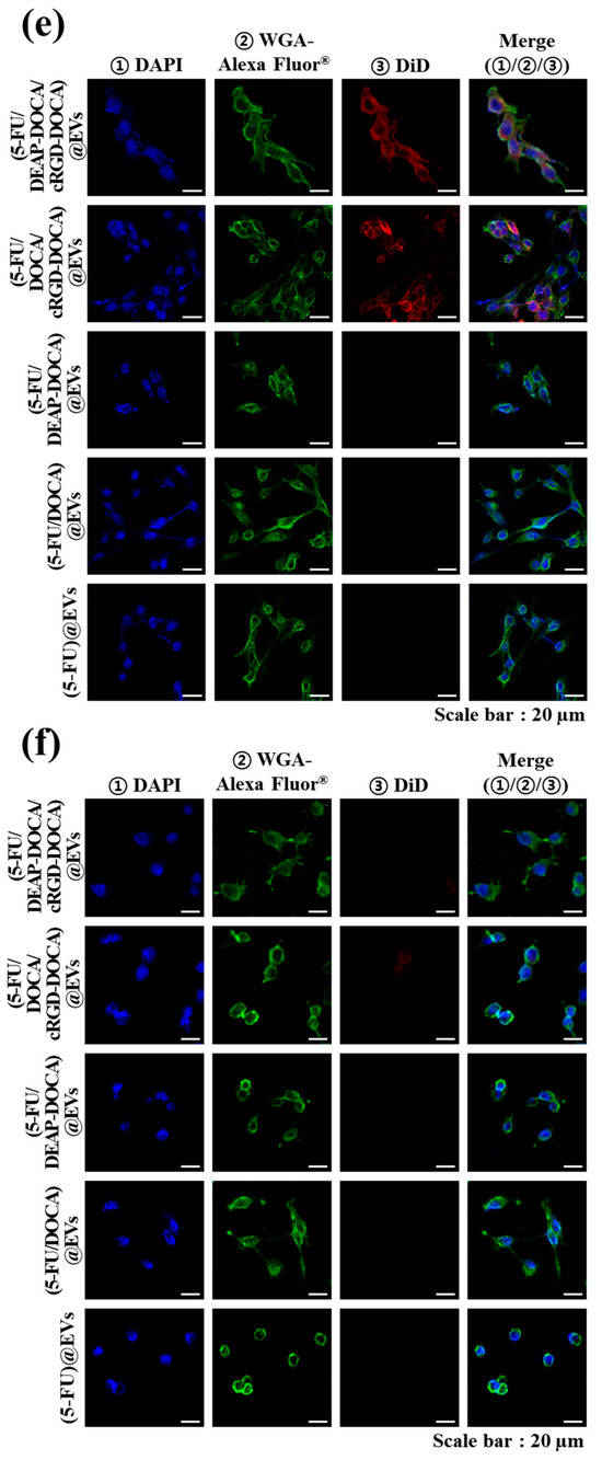 Deoxycholic acid (DOCA), 3-(diethylamino)propylamine (DEAP), dimethylsulfoxide (DMSO), N-(3-dimethylaminopropyl)-N′-ethylcarbodiimide hydrochloride (EDC), N-hydroxysuccinimide (NHS), N-(2-aminoethyl)maleimide (AEM) trifluoroacetate salt, 5-fluorouracil (5-FU), 4′,6-diamidino-2-phenylindole dihydrochloride (DAPI), and paraformaldehyde were purchased from Sigma-Aldrich (St. Louis, MO, USA). Cyclic arginine-glycine-aspartic acid (cRGD) and TAMRA-labeled cRGD were purchased from Peptron, Inc. (Daejeon, Republic of Korea). Phosphate-buffered saline (PBS), Dulbecco’s modified Eagle’s medium (DMEM), penicillin, streptomycin, fetal bovine serum (FBS), trypsin, and ethylene diamine tetra-acetic acid (EDTA) were purchased from Welgene Inc. (Seoul, Republic of Korea). EV-depleted FBS was purchased from System Biosciences Inc. (Palo Alto, CA, USA). The Micro BCA™ Protein Assay Kit and 1,1′-dioctadecyl-3,3,3′,3′-tetramethylindotricarbocyanine iodide (DiR) were purchased from Thermo Fisher Scientific Inc. (Waltham, MA, USA). The total Bile Acid Assay Kit was purchased from Cell Biolabs, Inc. (San Diego, CA, USA). The Cell Counting Kit-8 (CCK-8) was purchased from Dojindo Molecular Technologies Inc. (Rockville, MD, USA). 1,1′-Dioctadecyl-3,3,3′,3′-tetramethylindodicarbocyanine and 4-chlorobenzenesulfonate salt (DiD) were purchased from Biotium, Inc. (Fremont, CA, USA). Wheat Germ Agglutinin Alexa Fluor® 488 conjugate (WGA-Alexa Fluor® 488) was purchased from Life Technologies (Carlsbad, CA, USA).