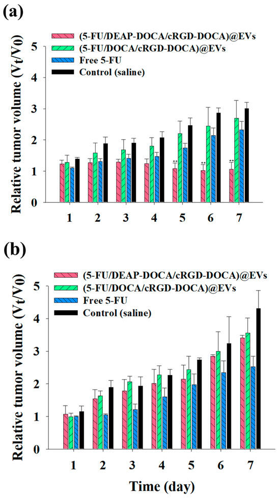 The therapeutic efficacy of the EV samples was investigated in B16BL6 (at the left thigh)/CT-26 (at the right thigh) tumor-bearing mice (Figure 6). Here, the (5-FU/DEAP-DOCA/cRGD-DOCA)@EVs (equivalent to 5-FU 20 mg/kg), (5-FU/DOCA/cRGD-DOCA)@EVs (equivalent to 5-FU 20 mg/kg), and free 5-FU (20 mg/kg) were intravenously administered, and the tumor volumes were monitored for 7 days. At 7 days post-injection, the relative B16BL6 tumor volume in the mice treated with (5-FU/DEAP-DOCA/cRGD-DOCA)@EVs was approximately 2.5, 2.2, and 2.8 times smaller than those in the mice treated with (5-FU/DOCA/cRGD-DOCA)@EVs, free 5-FU, and control (saline), respectively (Figure 6a). However, the relative CT-26 tumor volume in the mice treated with (5-FU/DEAP-DOCA/cRGD-DOCA)@EVs was almost 1.3 times larger than that in the mice treated with free 5-FU. There was no significant difference in the CT-26 tumor volume between the mice treated with (5-FU/DEAP-DOCA/cRGD-DOCA)@EVs, (5-FU/DOCA/cRGD-DOCA)@EVs, and control (saline) (Figure 6b). These results suggest that (5-FU/DEAP-DOCA/cRGD-DOCA)@EVs can effectively inhibit B16BL6 tumor growth in vivo, as demonstrated in the in vitro cytotoxicity test (Figure 5a).