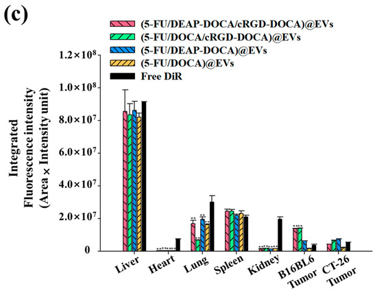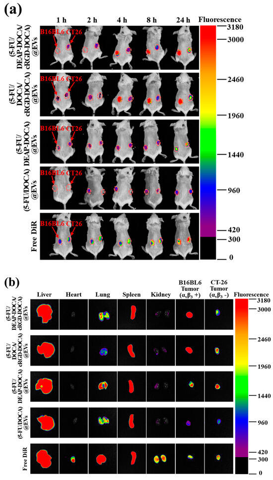 To evaluate the in vivo tumor-targeting efficacy of the EV samples, we labeled them with a fluorescent DiR dye. The amount of DiR dye labeled per 1 mg of each EV sample was approximately 0.02 mg. The DiR dye labeled on EVs was assessed after solubilizing the EVs in DMSO/PBS (90/10, vol.%) and by analyzing them using a microplate reader (Bio-Tek, Winooski, VT, USA) at λex 748 nm and λem 780 nm [37,48]. Each EV sample (equivalent to DiR 2.0 mg/kg) and free DiR (2.0 mg/kg) were intravenously administered to B16BL6/CT-26 tumor-bearing mice, and the fluorescence was monitored for 24 h using the FOBI (Figure 7). At 4 h post-injection, strong fluorescence signals were observed at the B16BL6 tumor sites for the (5-FU/DEAP-DOCA/cRGD-DOCA)@EVs and (5-FU/DOCA/cRGD-DOCA)@EVs. However, the fluorescence signals from the other samples were relatively weak, possibly due to the lower accumulation of EV samples without cRGD-DOCA. At 24 h post-injection, to further confirm the biodistribution of the EV samples, we acquired fluorescence images of the major organs (liver, heart, lungs, spleen, and kidneys) and tumors. Free DiR was evenly distributed in all the major organs and tumors, while the (5-FU/DEAP-DOCA/cRGD-DOCA)@EVs and (5-FU/DOCA/cRGD-DOCA)@EVs were primarily concentrated in the organs (liver and spleen) associated with the reticuloendothelial system [49] and tumors (Figure 7b). As depicted in Figure 7c, the (5-FU/DEAP-DOCA/cRGD-DOCA)@EVs and (5-FU/DOCA/cRGD-DOCA)@EVs exhibited 3.3-fold and 2.1-fold higher integrated fluorescence intensity in the B16BL6 tumors compared to the CT-26 tumors, respectively. Moreover, in the B16BL6 tumors, they demonstrated 2.2-fold, 8.7-fold, and 3.8-fold higher intensity than the (5-FU/DEAP-DOCA)@EVs, (5-FU/DOCA)@EVs, and free DiR, respectively, indicating that cRGD-DOCA enhances the targeting efficiency of EVs for B16BL6 tumors expressing αvβ3 integrin receptors. Collectively, the (5-FU/DEAP-DOCA/cRGD-DOCA)@EVs incorporating DEAP-DOCA and cRGD-DOCA exhibited significant antitumor efficacy (Figure 6a). Overall, this EV system, derived from cells, is expected to exhibit excellent biocompatibility and biofunctionality compared to conventional liposome-based systems [32,33]. Specifically, in this study, functionalization of the EV system was accomplished using pH-responsive adjuvants, indicating that such systems may provide diverse therapeutic modalities for future tumor treatments. Moreover, the methods utilized here to target αvβ3 integrin show promise for pertinent tumor therapies [36,37,38].