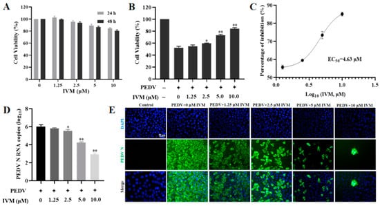 Numerous studies have recently reported the antiviral properties of IVM, which could impede viruses by hindering nuclear input that was reliant on specific IMPα/β1-dependent viral proteins [2]. This study investigated the antiviral activity of IVM against PEDV in vitro. Prior to assessing its inhibitory potency, cytotoxicity assays were conducted on Vero cells. The results indicated that cell viability remained above 80% at concentrations ranging from 0 to 10 µM (Figure 1A). After excluding cytotoxicity, the inhibitory effect of IVM on PEDV-infected Vero cells was evaluated. Specifically, Vero cells were infected with 0.05 MOI of PEDV and subsequently treated with varying concentrations of IVM. Furthermore, a discernible difference was observed among the virus control group after 2.5 or 5 μM IVM treatment, and cell viability could reach more than 80% after 10 μM IVM treatment, as illustrated in Figure 1B. We calculated the concentration for 50% of maximal effect (EC50) value, which reflected the concentration of IVM required to abolish infectious virus particle production by 50%. The EC50 value for IVM following infection with PEDV in Vero cells was 4.63 μM (Figure 1C). Furthermore, the administration of IVM at concentrations of 1.25, 2.5, 5, and 10 μM resulted in a reduction of PEDV RNA N copies at 12 h post-infection from 6.1 to 5.8, 5.5, 4.8, and 3.8 lg copies, respectively, in comparison to the untreated cohort (Figure 1D). Notably, the PEDV nucleocapsid (N) protein, an RNA-binding protein crucial for the virus life cycle, could serve as a precise and early diagnostic target for PEDV infection [34,35]. The inhibitory effect of IVM on PEDV proliferation was verified by detecting the expression level of PEDV N protein. Specifically, the infected cells were incubated with different concentrations of IVM. As shown in Figure 1E, at 24 hpi, a strong fluorescent signal was observed within the PEDV-infected Vero cells treated with DMSO by indirect immunofluorescence. However, we observed a significant and concentration-dependent difference between untreated infected cells and IVM-treated infected cells, which was in accordance with the growth curves of the virus.