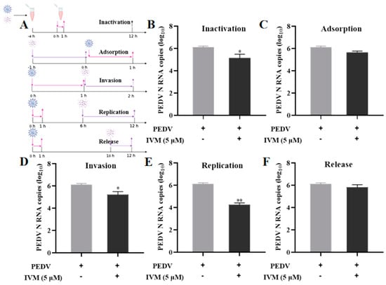 IVM treatment at multiple stages of inhibition of PEDV proliferation. (A) Schematic diagram of the effect of IVM on the replication cycle of PEDV. (B) Effect of IVM on direct inactivation of PEDV. Effect of IVM on the (C) adsorption, (D) invasion, (E) replication, and (F) release processes of infected cells. The mean value was calculated by the t-test (mean ± SD, n = 3). * p < 0.05, ** p < 0.01, compared with the PEDV group.