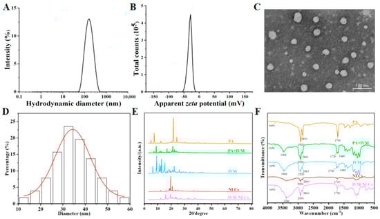 Characterization of the optimized IVM-NLCs. (A) Hydrodynamic diameter (HD) and (B) zeta potential (ZP) of the IVM-NLCs were determined by DLS. (C) The morphology of the IVM-NLCs was observed by TEM, and (D) the size distribution was obtained via analysis of the particles from several TEM images. Scale bar = 100 nm. (E) X-ray diffraction (XRD) spectra and (F) Fourier transform infrared (FT-IR) spectra for IVM-NLCs, NLCs, physical mixture, IVM, and PA were shown.