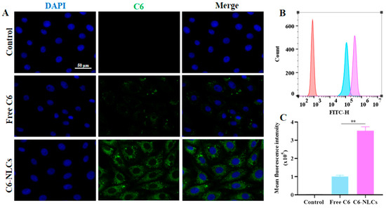 Effect of NLCs on the cellular uptake of coumarin-6 (C6) in Vero cells. (A) Representative fluorescence microscope images of various preparations uptake in Vero cells. (B) Cell uptake was determined by flow cytometry of C6 in Vero cells after treatment with free C6 and C6-NLCs and (C) mean intracellular fluorescence intensity. Scale bar = 50 μm. The mean value was calculated by the t-test (mean ± SD, n = 3). ** p < 0.01, for C6-NLCs vs. free C6.