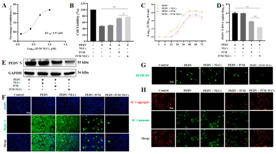 Anti-PEDV activity of IVM-NLCs on Vero cells. (A) EC50 of IVM-NLCs was calculated with GraphPad Prism 8.0. (B) Antiviral activity of NLCs, IVM, and IVM-NLCs (5.0 μM) measured by CCK-8 assay. (C) One-step growth curve of virus after treatment or without treatment with NLCs, IVM, and IVM-NLCs. (D) PEDV N RNA copies of Vero cells infected with PEDV after the treatment with NLCs, IVM, and IVM-NLCs by RT-qPCR. (E) Western blot analysis of the expression level of PEDV N protein under the treatment of NLCs, IVM, and IVM-NLCs. (F) Indirect immunofluorescence assay of infected cells. Blue, DAPI; green, FITC-conjugated goat anti-mouse antibody. (G) Cellular reactive oxygen species (ROS) level in infected cells post different treatments. (H) Mitochondrial membrane potential (MMP) in infected cells post different treatments. Scale bar = 50 µm. Error bars represent the standard deviation from three repeated experiments. The mean value was calculated by the one-way analysis of variance (ANOVA) (mean ± SD, n = 3). * p < 0.05, ** p < 0.01.