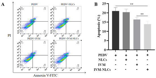 Apoptosis of PEDV-infected Vero cells after treatment with IVM-NLCs. (A) Apoptosis assay was performed in PEDV-infected Vero cells treated with NLCs, IVM (5 μM), and IVM-NLCs (5 μM). (B) The graph represents the percentage of apoptosis in Vero cells after treatment. The mean value was calculated by the one-way analysis of variance (ANOVA) (mean ± SD, n = 3). ** p < 0.01.