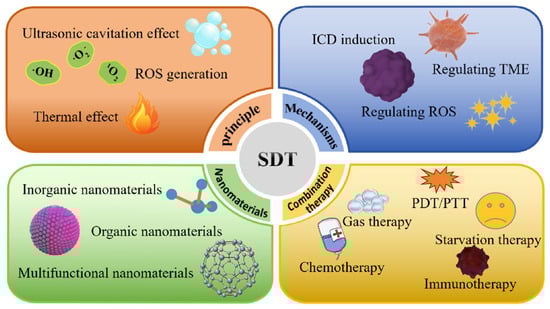 Nanomaterial-based SDT combination therapy is a strategy in which SDT is integrated with other therapeutic approaches to enhance treatment efficacy and broaden the scope of treatment. This approach harnesses the diverse properties of nanomaterials to improve therapeutic effectiveness while minimizing side effects, offering a more potent treatment option for challenging medical conditions. In the present study, it has been demonstrated that combining SDT with PDT, PTT, gas therapy, chemotherapy, starvation therapy, and immunotherapy can enhance the efficiency of treating malignant tumors [,,,].