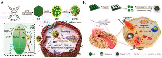 PDT generates ROS when exposed to near-infrared (NIR) light, and the use of NIR-responsive photosensitizers can improve its penetration depth. However, PDT has certain limitations when it comes to treating deep-seated tumors []. On the other hand, NIR-mediated PTT shows promise as an effective antitumor approach [,,]. PTT utilizes NIR light energy to activate a photothermotransduction agent (PTA), which generates heat rapidly for therapeutic purposes, leading to cancer cell death. Therefore, combining PTT with SDT becomes necessary to overcome these limitations and optimize treatment outcomes. Xu et al. aimed to enhance the efficacy of SDT and PDT for tumor treatment (Figure 5A) []. They first facilitated the self-assembly of manganese porphyrin NPs (MnTEPP) to synthesize manganese porphyrin (SM) NPs. Subsequently, by attaching the porphyrin terminal alkynyl group, they initiated the in situ growth of gold NPs on the surface of SM NPs, resulting in the formation of plasmonic SMA heterostructures. Further modifications involving hyaluronic acid (HA) led to the synthesis of water-soluble and targeted SMAH nanocomplexes. This nanocomplex can provide thermotherapy and large amounts of 1O2 via NIR-II light and US irradiation, which can be used to kill tumor cells. In the cited study, the synergistic therapeutic effect of SDT/PDT/PTT was improved by increasing the yield of 1O2. Furthermore, Liang et al. designed Pt-CuS NPs with good water solubility and biocompatibility (Figure 5B) []. These NPs contain a hollow semiconductor, CuS, for the loading of the acoustic sensitizer (tetra-(4-aminophenyl) porphyrin, TAPP), thus realizing SDT. Pt-CuS NPs can act as photothermal converters under 808 nm laser irradiation, and the deposition of Pt has nano-enzymatic activity that increases SDT-induced production of highly toxic ROS, thus promoting apoptosis. Thus, the synergistic effect of SDT and PTT can efficiently kill tumor cells and regulate cancer therapy.