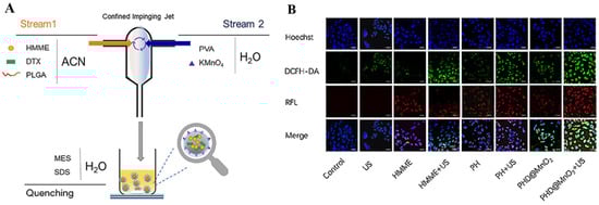 Combined treatment with SDT and chemotherapy. (A): One-step preparation of PLGA-HMME-DTX@MnO2 NPs via flash nanoprecipitation. (B): Cellular ROS generation in MCF-7 cells. The white scale bars represent 25 μm Reproduced with permission from Ref. [].