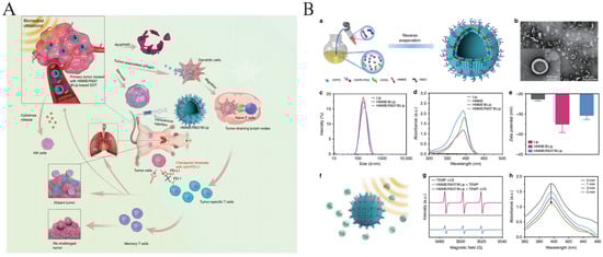 SDT has the capability to release numerous TAAs, thereby stimulating the body’s immune system to mount an immune response against tumor cells. Furthermore, SDT plays a crucial role in enhancing the TME, boosting the infiltration and activity of immune cells, consequently augmenting the efficacy of immunotherapy. Additionally, SDT has the potential to induce apoptosis and necrosis in tumor cells, leading to the liberation of additional tumor antigens, which further enhances the cytotoxic effect of immune cells. These combined effects contribute significantly to improved treatment outcomes. The programmed cell death-1/programmed cell death-Ligand 1 (PD-1/PD-L1) signaling pathway serves as a critical mechanism through which tumor cells evade immune surveillance. Immunotherapies targeting the PD-1/PD-L1 signaling pathway have emerged as a leading strategy for treating a diverse array of tumors, aiming to disrupt this immune evasion mechanism and enhance the immune response against cancer cells []. However, immunotherapy does not have significant therapeutic effects on all patients, and adverse reactions may occur among some patients. By combining SDT with immunotherapy, there is a promising opportunity to overcome the constraints and limitations of immunotherapy. This synergistic approach has the potential to enhance treatment outcomes significantly, mitigating adverse reactions while improving therapeutic effectiveness. Yue et al. prepared a nanoplatform (HMME/R837@Lip) of liposome-encapsulated HMME and the immune adjuvant imiquimod (R837) (Figure 7) []. As shown through in vivo and in vitro experiments, anti-PD-L1 checkpoint blockade contributes to enhanced immune response, and HMME/R837@Lip-mediated SDT in combination with anti-PD-L1 checkpoint blockade immunotherapy was able to halt primary tumor progression while providing long-term immune memory to prevent tumor recurrence. This combination therapy strategy utilizes antigens released after tumor cell death to stimulate the immune system in combination with immunotherapy and checkpoint blockade, demonstrating potential synergistic effects and offering new ideas and possibilities for tumor treatment.