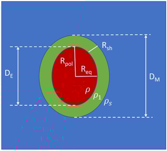 where the maximum sizes of the whole micelle and its core are given by DM and DE, respectively, and are schematically shown in Figure 1. Here, ε = Rpol/Req is the ratio between the polar Rpol and equatorial Req radius of the micelle’s core, and DM = 2Rpol + 2Rsh, DE = 2Rpol, where Rsh is the shell size. For prolate spheroids (ε > 1), DM coincides with the maximum size of the micelle, namely Dmax. For oblate spheroids (ε < 1), DM = εDmax.