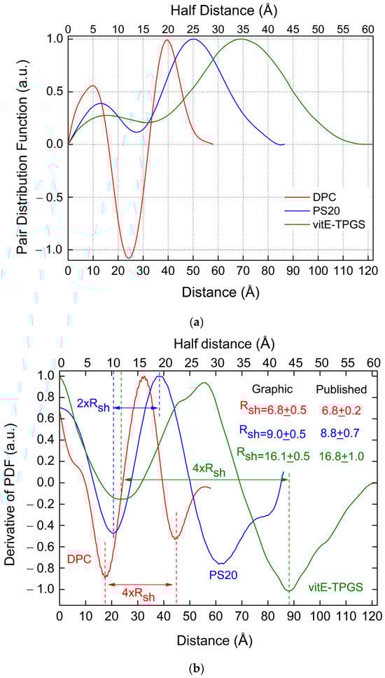 Drug-loaded micelles, as discussed in Section 3, could present a spheroidal internal structure more complex than a two-component case, here assumed. In that case, it will be necessary to assume a micelle structure consisting of more than two components. The inspection of the first derivative of the PDF, here proposed, could give some useful information about the presence of more than two components in the structure of the studied micelles, and the model could then be extended with an additional shell, as already discussed in [4], to have more detailed information on the influence of the loaded drug on the micelles’ shape as well as on the spatial position of the drug, either inside the micelle or linked to its hydrophobic-hydrophilic interface, as demonstrated for vitE-TPGS added with PSC [4].