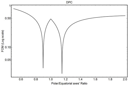 Figure 5 shows the FOM output for DPC (Equation (A31)) of Appendix A. The two minima of the FOM indicate possible solutions. The FOM indicates almost equivalent prolate and oblate-shaped solutions, not far from the spherical shape.