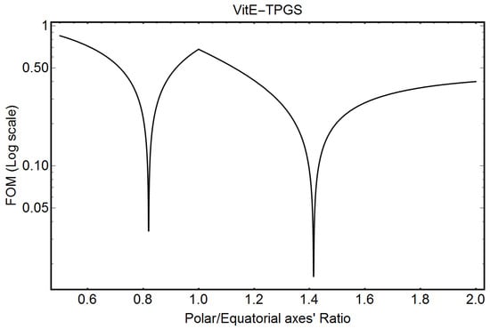 Figure 6 shows the FOM output for VitE-TPGS micelles evaluated by Equation (A31) of Appendix A. The minimum of the FOM indicates the solution. Equation (4) gives 0.81 and 0.19 as relative probabilities for the prolate and oblate solutions in Figure 6, respectively.