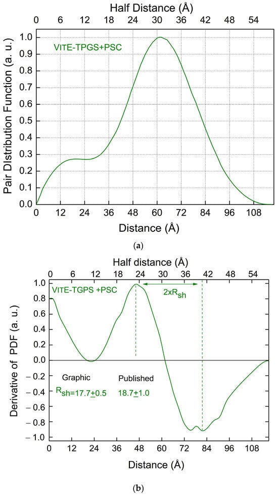 It is interesting to note the presence of two very close minima in Figure 7b in the region between 72 and 84 Å, a feature that is not visible in the green curve of Figure 2b, obtained for VitE-TPGS micelles without PSC. This feature can be explained by the presence of PSC molecules (Eltrombopag) linked to the VitE-TPGS hydrophobic-hydrophilic interface in the region of the linker, as discussed in [4]. It is worth noting that the first derivative of the PDF seems to provide a direct visualization of a change in the structure of the micells after the drug loading, as discussed in [4].