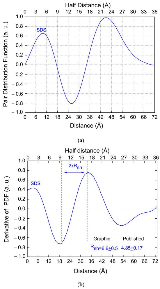 This double distance between maxima and minima in the PDF derivative can be explained by the fact that the hydrophilic part of the micelle has a variable thickness ranging from 0 to Rsh, caused by random movements of the hydrophilic chains into the buffer liquid. These random variations of the shell thickness influence the actual PDF size values. Indeed, if x, y are discrete independent random shell size fluctuations along two independent axes of the micelle, with probability functions f(x) and g(y), then the probability that x + y = d is the sum of possible values of x of the product f(x) × g(d − x). This is the definition of a convolution, which could be mathematically taken into account in the PDF by considering it convolved with a suitable function of width × Rsh = Rsh, the variations of the shell thickness along the two considered axes, being two independent random processes. The same happens for three independent random shell size fluctuations along the three principal axes of the spheroid-shaped micelle, implying a convolution of PDF with a suitable function of width Rsh. Therefore, the difference between the maximum and minimum of the derivative of the PDF, which is the integral of all angular directions over the whole solid angle, will be characterized by a width of the order of × Rsh = 2Rsh, i.e., twice the shell size, i.e., twice the value that we would have expected for an ideal shell without any random size variation. This relationship is verified in Figure 2b for all three considered experimental cases [4,12,13], on micelles made by three different monomers. This property can be used for a quick and reliable estimate of the shell size directly from the distances between peaks of the PDF derivative, as previously shown. Moreover, given the maximum distance, Dmax, determined from the PDF profile where it falls to 0, the quantity Dmax/2 − Rsh can then be readily calculated. This is the polar core half-size Rpol for prolate spheroids or the equatorial core half-size Req for oblate spheroids.