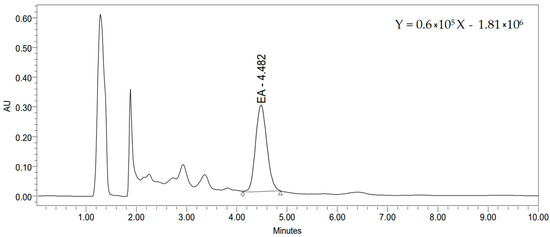 Due to its various biological effects, ellagic acid is considered as the most important phenolic compound found in raspberry seeds. Some of the most investigated activities of ellagic acid were antioxidant, anti-carcinogenic, anti-obesity, anti-inflammatory, and anti-angiogenic, anti-neurodegenerative, hepatoprotective activity [51,52]. EA has the ability to scavenge free radicals and, therefore, reduce oxidative stress, which promotes the occurrence of various diseases. Free ellagic acid content determined in the DES extract of defatted raspberry seeds was in the range of 25.2–52.4 mg/L, while the total ellagic acid content was found to be from 66.3 to 86.5 mg/L (Table 2). The highest free and total content of EA was found in proline/citric acid extract (52.4 and 86.5 mg/L, respectively). Figure 1 shows a chromatogram of the proline/citric acid extract of defatted raspberry seed and regression equation (R2 = 0.997).