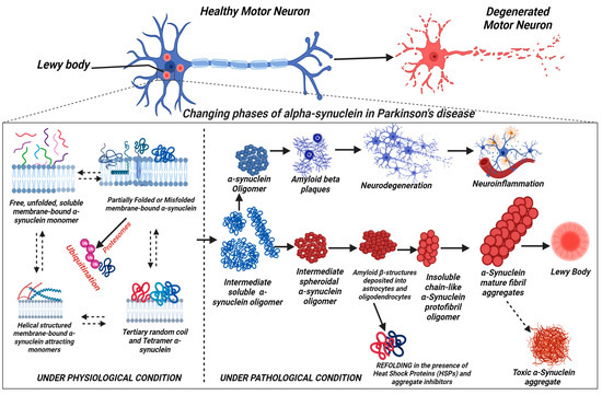 Figure 2. Schematic representation of the aggregation of α-synuclein (α-Syn) in Parkinson’s disease. The unfolded membrane-bound α-Syn is a monomer, which is in equilibrium with the free soluble α-Syn in the physiological solution. Helical structured α-Syn attracts free monomers to for α-Syn aggregates, leading to the formation of oligomers, amyloid sheets, protofibrils, mature fibrils, and Lewy bodies, respectively. Created with BioRender.com (accessed on 30 October 2023).