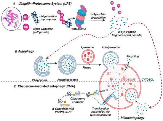 Figure 3. Schematic representation of the degradation of α-synuclein. (A) is the hypothetical representation of the ubiquitin-proteasome system (UPS), (B) represents autophagy of the α-synuclein fragments and conformers, (C) is the chaperone-mediated autophagy and microautophagy. Created with BioRender.com (accessed on 24 December 2023).
