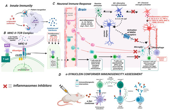 Figure 4. Schematic representation of immune response of α-synuclein (α-Syn) in Parkinson’s disease. (A) Innate immune response, (B) MHC-II-T cell receptor complex, (C) neuronal immune response to alpha-synuclein conformers, (D) alpha-synuclein conformers immunogenicity assessment. Created with BioRender.com (accessed on 24 December 2023).