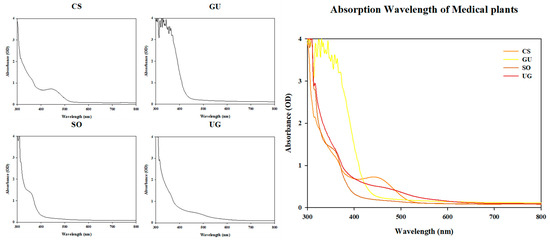 Absorption peaks of natural phytochemical extracts used in the experiment. The absorbance of each natural phytochemical extract at 4 mg/mL was measured. CS is Caesalpinia sappan L.; GU is Glycyrrhiza uralensis Fisch.; SO is Sanguisorba officinalis L.; UG is Uncaria gambir Roxb.