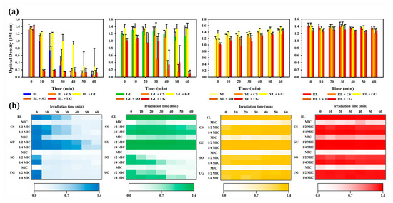 To determine the synergy conditions for antibacterial activity, a heat map was prepared according to the concentration of the natural phytochemical extracts and the irradiation time of visible light (Figure 2b). Natural phytochemical extracts were diluted two-fold from the MIC and measured for S. aureus treated with a single extract at one-fourth MIC. Visible light irradiation time was measured from 0 min to 60 min at intervals of 10 min. When BL was used for irradiation and measurement of antibacterial activity was performed at intervals of 10 min, measurement time results of antibacterial activity for half MIC and one-fourth MIC of natural phytochemical extracts were the same. When GL was used for irradiation and when GL single treatment and CS or GU were simultaneously used for treatment, antibacterial activity was not measured up to 60 min. During the simultaneous treatment with GL or SO, the half MIC of SO showed an antibacterial activity from 20 min and the one-fourth MIC of SO showed an antibacterial activity from 40 min. When GL single treatment and CS or GU were simultaneously used for treatment, the antibacterial activity was not measured up to 60 min. During simultaneous treatment with GL or UG, the antibacterial activity was measured from 30 min at half MIC and from 60 min at one-fourth MIC. When irradiated with YL or RL, the antibacterial activity was not measured in any situations up to 60 min.