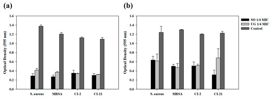 Synergistic effect of antibacterial activity against S. aureus and MRSA. (a) Optical density against S. aureus and MRSA when simultaneously treated with 1/4 MIC of natural phytochemical extract and irradiated at 465 nm for 10 min. (b) Optical density against S. aureus and MRSA when simultaneously treated with 1/4 MIC of natural phytochemical extract and irradiated at 520 nm for 40 min.