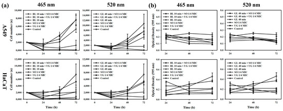 Cell physiological activities when simultaneously treated with 1/4 MIC of natural phytochemical extract and irradiated at 465 nm for 10 min against A549 and HaCaT cell lines. (a) Cell proliferation. (b) Cellular metabolic activity.
