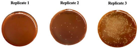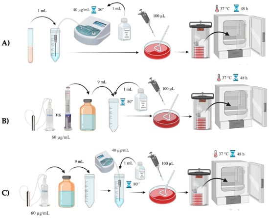 As illustrated in Figure 1, 1 mL of the bacterial suspension was diluted in 9 mL of sterile Milli-Q ultrapure water (Merck-Millipore, Darmstadt, Germany). The gaseous ozone was applied directly to the diluted suspension using an extender and a Sterican irrigation needle (B. Braun, Melsungen, Germany) connected to the Ozonette Dent generator (Sedecal, Madrid, Spain) in continuous mode at a concentration of 40 μg/mL, with a flow rate of 30 L/h. After 80 s, 1 mL of 10% sodium thiosulfate (VWR, Radnor, USA) was added to inactivate the ozone. Afterwards, 100 μL of the experimental mixture was inoculated on specific culture medium (blood agar for Streptococcus, chocolate agar (CHOC) for Actinomyces, and MRS (De Man–Rogosa–Sharpe) agar for Lactobacillus) and placed in the incubator at 37 °C for 48 h (microaerophilic conditions for Lactobacillus and anaerobic conditions for the others).