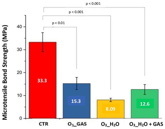 Bar chart comparing the four experimental groups in relation to the microtensile bond strength test (MPa). The CTR group average (33.3 MPa) is significantly higher compared to the O3_GAS group (15.3), O3_H2O (8.09 MPa), and O3_H2O + GAS (12.6 MPa). Thus, there were significant differences between the CTR group and the other ozone groups. The error bars shown correspond to the standard errors of the means.