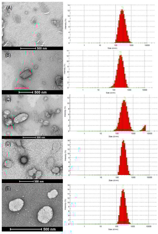 Transmission electron microscopy and particle size histograms obtained by DLS of (A) SLN, (B) SLN-SIB, (C) SLN-SIB-U, (D) PN and (E) PN-SIB panels.