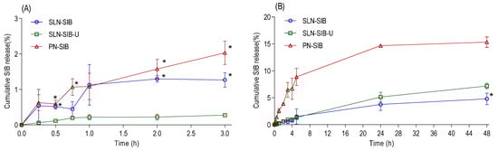 Release assays were performed in SGF (pH 1.2) and PBS (pH 7.4) for up to 3 h and 48 h, respectively. The SIB release values in SGF (Figure 2A) indicate that SLN-SIB-U provided less release than SLN-SIB and PN-SIB, particularly at 0.5, 2, and 3 h. These release values indicate that the addition of URSO increased the protection of the nanosystem against the gastric environment, corroborating the zeta potential and morphology results. No significant differences were observed in the release profiles of the SLN-SIB and PN-SIB groups (p > 0.05).