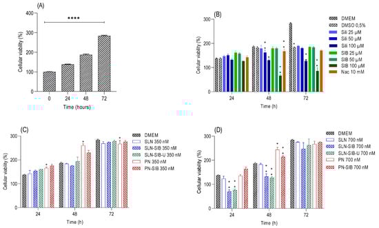 Proliferation assays at 24, 48, and 72 h were performed on the GRX cell line. Panel (A). Evaluation of control cell growth at 0, 24, 48, and 72 h. **** p < 0.0001. Panel (B). Evaluation of pure substances at different concentrations—Sili (25 to 100 µM), SIB (25 to 100 µM), and Nac (10 mM)—in relation to the control DMEM—0.5% DMSO. Panel (C). Evaluation of nanosystems at 350 nM in relation to control DMEM and empty nanosystems. Panel (D). Evaluation of nanosystems at 700 nM in relation to control DMEM and empty nanosystems. The results are expressed as the mean ± SD, n = 4, * p < 0.05; ** p < 0.05, **** p < 0.0001.