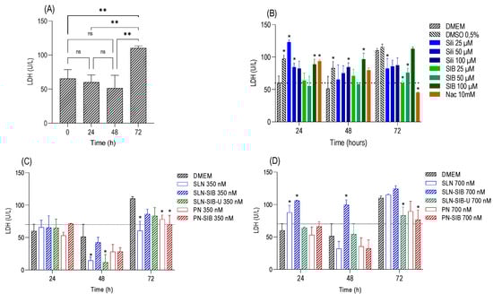 LDH cytotoxicity was measured at 24, 48, and 72 h in the GRX cell line. Panel (A). Evaluation of control cell growth at 0, 24, 48, and 72 h. ** p < 0.01. Panel (B). Evaluation of pure substances at different concentrations—Sili (25 to 100 µM), SIB (25 to 100 µM), and Nac (10 mM)—in relation to the control DMEM (0.5% DMSO). Panel (C). Evaluation of nanosystems at 350 nM in relation to control DMEM and empty nanosystems. Panel (D). Evaluation of nanosystems at 700 nM in relation to control DMEM and empty nanosystems. The results are expressed as the mean ± SD, n = 4, * p < 0.05; ns: not significant.