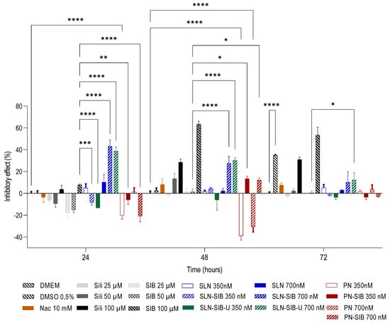 Inhibitory effect of pure substances at different concentrations - Sili (25 to 100 µM), SIB (25 to 100 µM), and Nac (10 mM)- and nanosystems at 350 and 700 nM (SLN-SIB, SLN-SIB-U, and PN-SIB) in relation to their respective controls (0.5% DMSO, SLN, and PN). The results are expressed as the mean ± SD. * p < 0.05. ** p < 0.005. *** p < 0.0005. **** p < 0.0001.