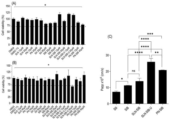 For the Caco-2 monolayer permeability assay, a cytotoxicity assay was performed in DMEM for 24 h (Figure 6A) and HBSS for 2 h (Figure 6B). This test was carried out with the aim of evaluating the best concentration of drugs and nanoparticles, guaranteeing the integrity of the monolayer during the entire assay. The data obtained from the 24 h cytotoxicity assay showed that only PN-SIB at a concentration of 40 µM had a significant effect on the growth control in DMEM. However, the cell viability was above 70% [68], indicating acceptable cell viability. The HBSS cytotoxicity assay was carried out to simulate the conditions of the Caco-2 monolayer permeability assay. This indicates that a concentration of 40 µM for nanosystems is not recommended for permeability assays. The results of this assay showed that the viability of cells treated with only 40 µM SLN-SIB-U was lower than that of cells treated with DMEM and lower than 70% [68]. Therefore, the use of a concentration of 40 µM is not recommended for permeability assays. At a concentration of 25 µM, no statistically significant differences were observed in relation to DMEM for any of the evaluated nanosystems. With this information, the concentration chosen for the assay was 25 µM.