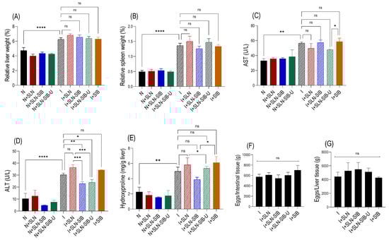 In vivo study results in a BALB/c mice model of Schistosoma mansoni infection. Panel (A). Relative liver percentage weight in relation to total animal weight. Panel (B). Relative spleen percentage weight in relation to total animal weight. Panel (C). Aspartate aminotransferase (AST) levels in the serum. Panel (D). Alanine aminotransferase (ALT) levels in the serum. Panel (E). Biochemical quantification of hydroxyproline. Panel (F). Distribution of eggs in intestinal tissue. Panel (G). Distribution of eggs in liver tissue. The results are expressed as the mean ± SD; n = 3; ns: not significant, * p < 0.05, ** p < 0.01, *** p < 0.001, **** p < 0.0001 for the experimental group vs. the I group.