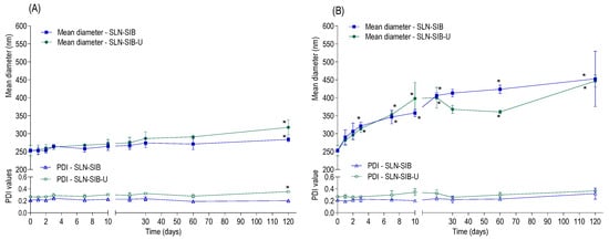 Stability of SLN-SIB and SLN-SIB-U in terms of mean diameter and polydispersity index (PDI) evaluated at 0, 1, 2, 3, 7, 10, 20, 30, 60, and 120 days. Panel (A). Stability under refrigeration (4 ± 0.2 °C). Panel (B). Stability at room temperature (25 ± 0.5 °C). The results are expressed as the mean ± SD, n = 3, * p < 0.05 in relation to time 0.